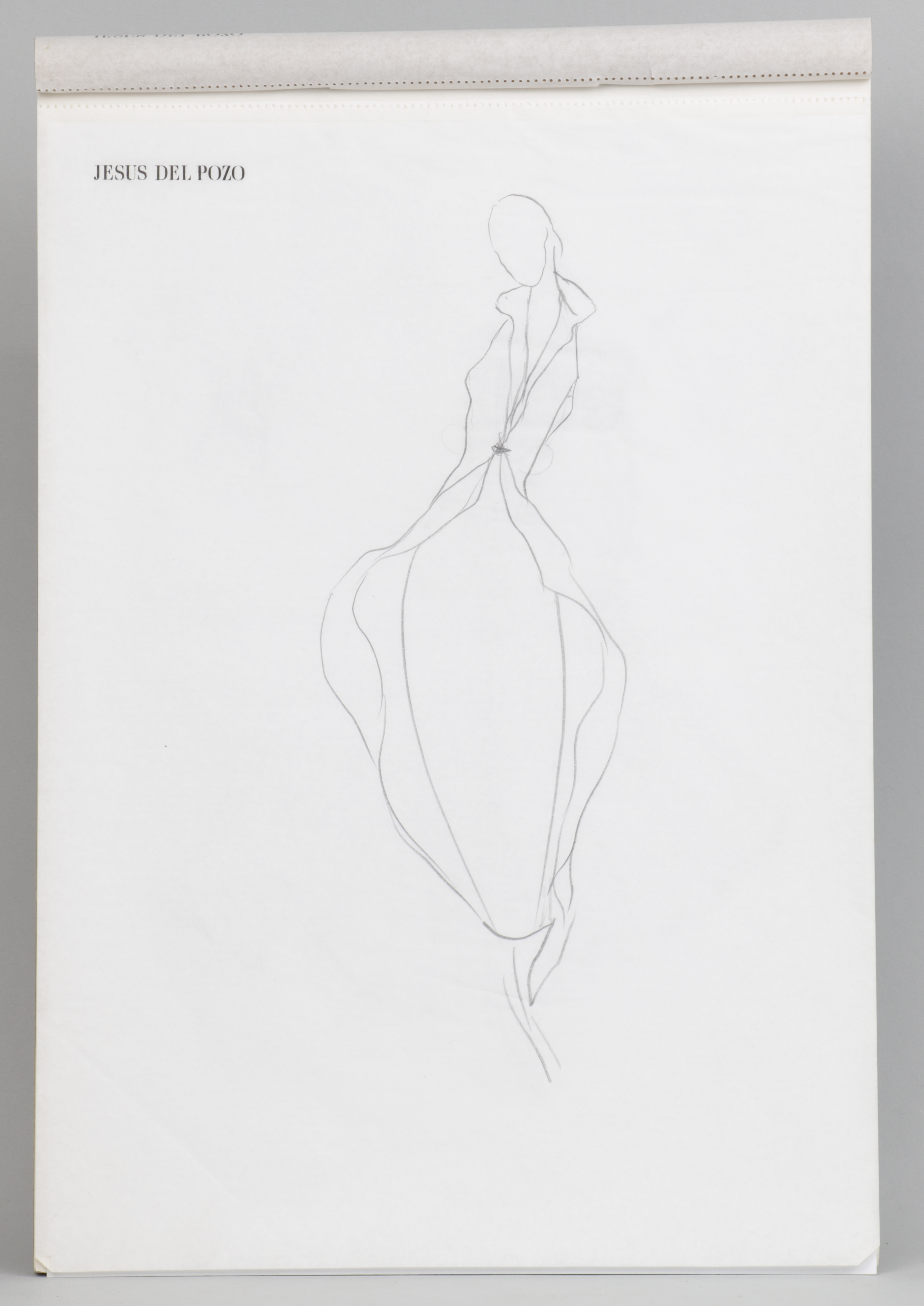 Boceto de moda realizado en grafito sobre papel. Reproduce un esbozo de figura femenina vestida con una prenda de cuerpo completo abierta en el centro. Un amplio volumen que parte de la cintura en la mitad inferior, abre la prenda y permite ver una falda lápiz ajustada al cuerpo hasta las rodillas.