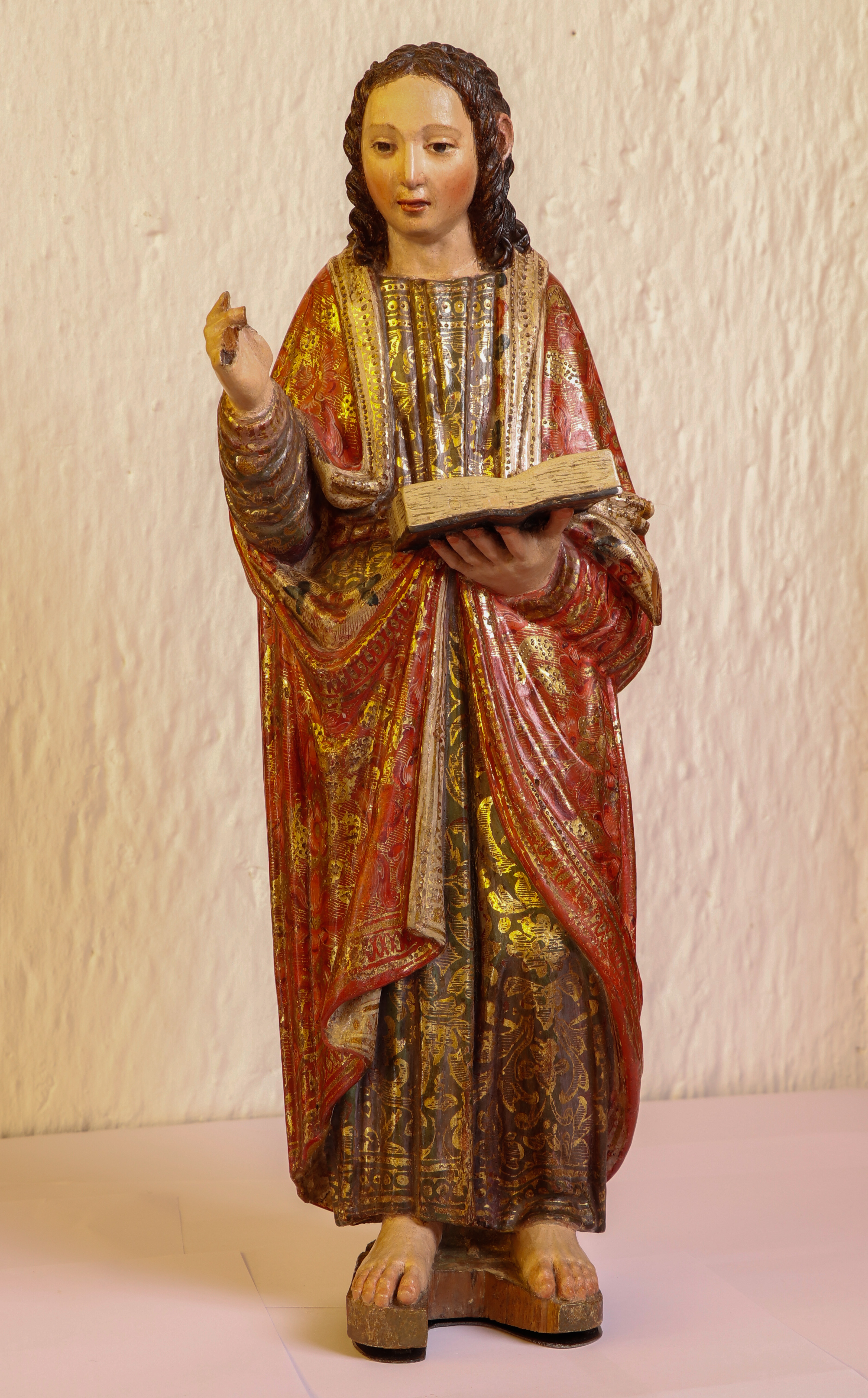 Esta pequeña escultura se ubica en la hornacina derecha del Sagrario del Retablo de los Santos Juanes. Iconográficamente, se representa como escritor, con el evangelio abierto en la mano izquierda y la pluma en la derecha actualmente perdida. De juvenil aspecto, la figura muestra un rostro ovalado enmarcado por amplios rizos cuya estructura recuerda las esculturas de Pablo de Rojas. El artista intenta romper el estatismo haciendo avanzar la pierna izquierda, mientras la derecha recibe el peso del cuerpo. Viste túnica gris-pardo y manto rojo ricamente estofados con motivos vegetales y geométricos. La espalda es recta y lisa, carente de talla y policromía, deja en esta zona la madera vista. Sus características estilísticas, al igual que las de San Juan Bautista, con la que forma pareja, permiten encuadrarlos en el tercer cuarto del Quinientos granadino, entre los discípulos de Siloé y los albores de Pablo de Rojas.