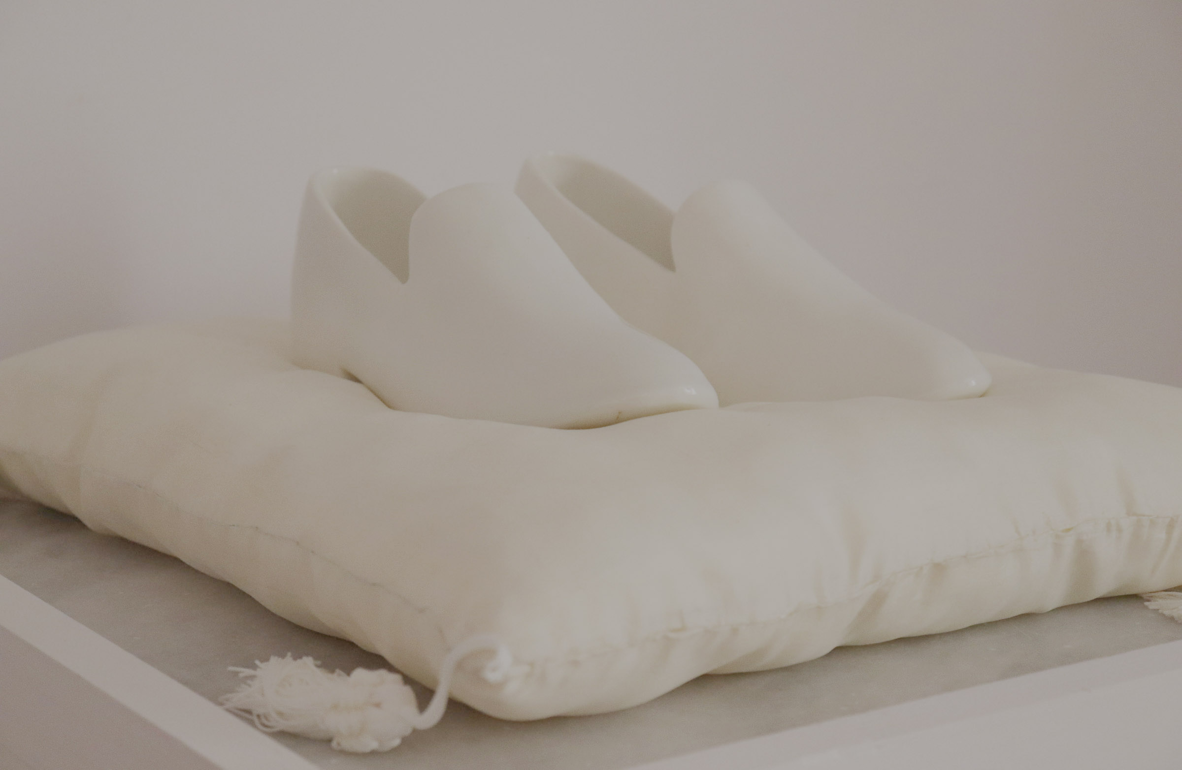Instalación escultórica organizada en torno a la presencia de un par de zapatos planos tipo mocasín, realizados en porcelana de alta temperatura con esmalte brillante y colocados sobre un cojín de seda blanco en cuyas esquinas penden borlones de seda. El artista produce la obra y, formando parte de la instalación, también la peana, compuesta por un volumen prismático de sección cuadrada y un fanal de cristal.