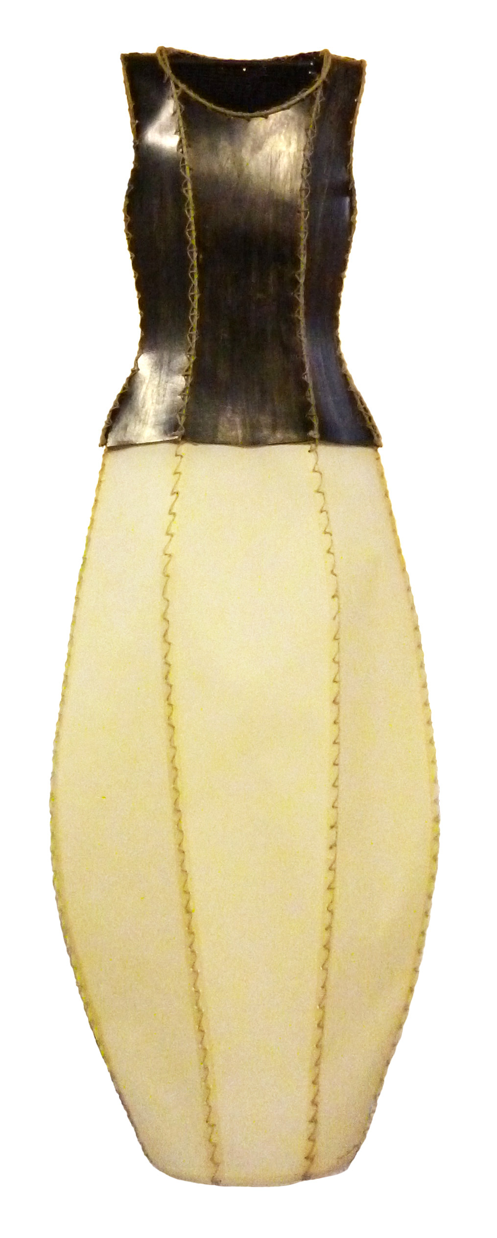 Vestido escultura compuesto por corpiño marrón oscuro de tirante ancho y escote ovalado, confeccionado en cartón cosido en secciones verticales con hilo bramante. Bajo el corpiño, una falda globo beige claro, realizada en igual material y técnica que el corpiño, completa el conjunto.
