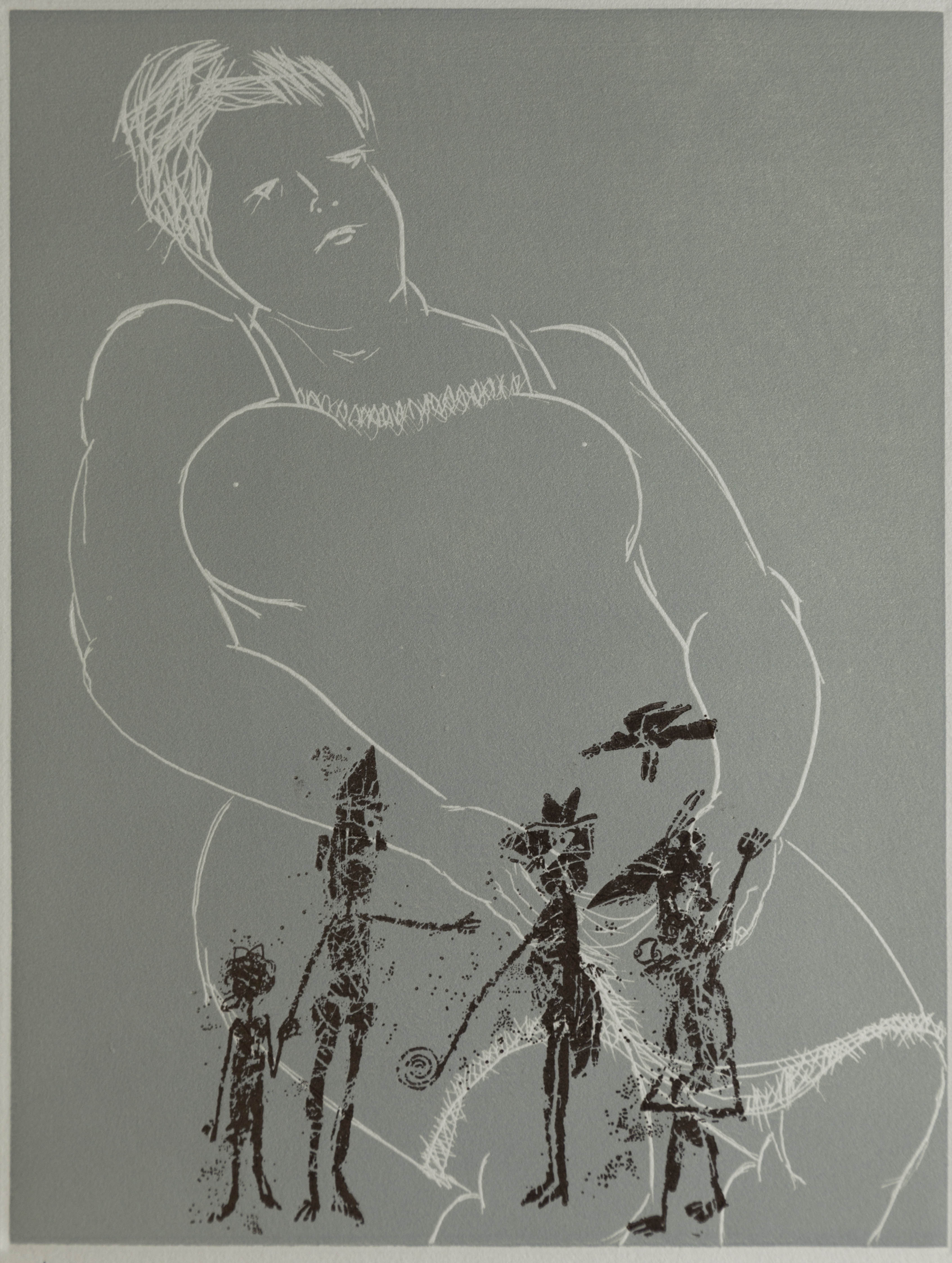 La huella produce un fondo gris que reserva el blanco del papel mediante la técnica de tratamiento de la plancha a la punta seca, para representar a una mujer recostada con las manos en el pubis y la ropa interior bajada hasta las rodillas. En la mitad inferior de la imagen se superponen cuatro figuras con cuerpo humano y extrañas cabezas, sobre las que sobrevuela un ave.