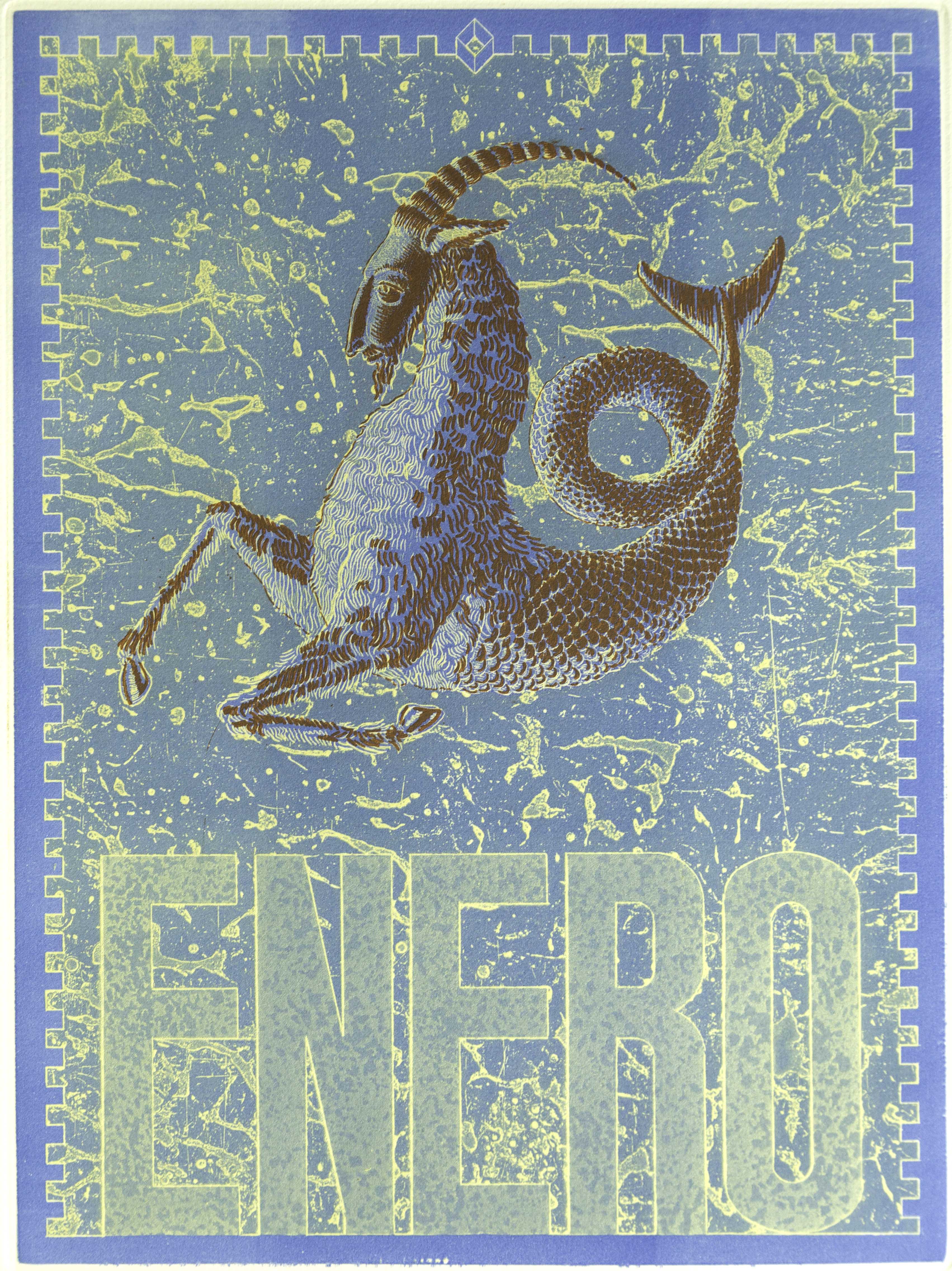 El cromatismo juega con una base azul pastel, tocada por tonos amarillos y marrones, para representar en la mitad inferior del grabado la palabra "ENERO" y en la mitad superior el ser mitológico asociado a Capricornio. La composición destaca por su equilibrio, marcado por la solidez de la estilizada tipografía de palo seco sobre la que aparece representado Egipán en una posición que lo enmarca en un círculo al tiempo que imprime dinamismo sobre su figura.
