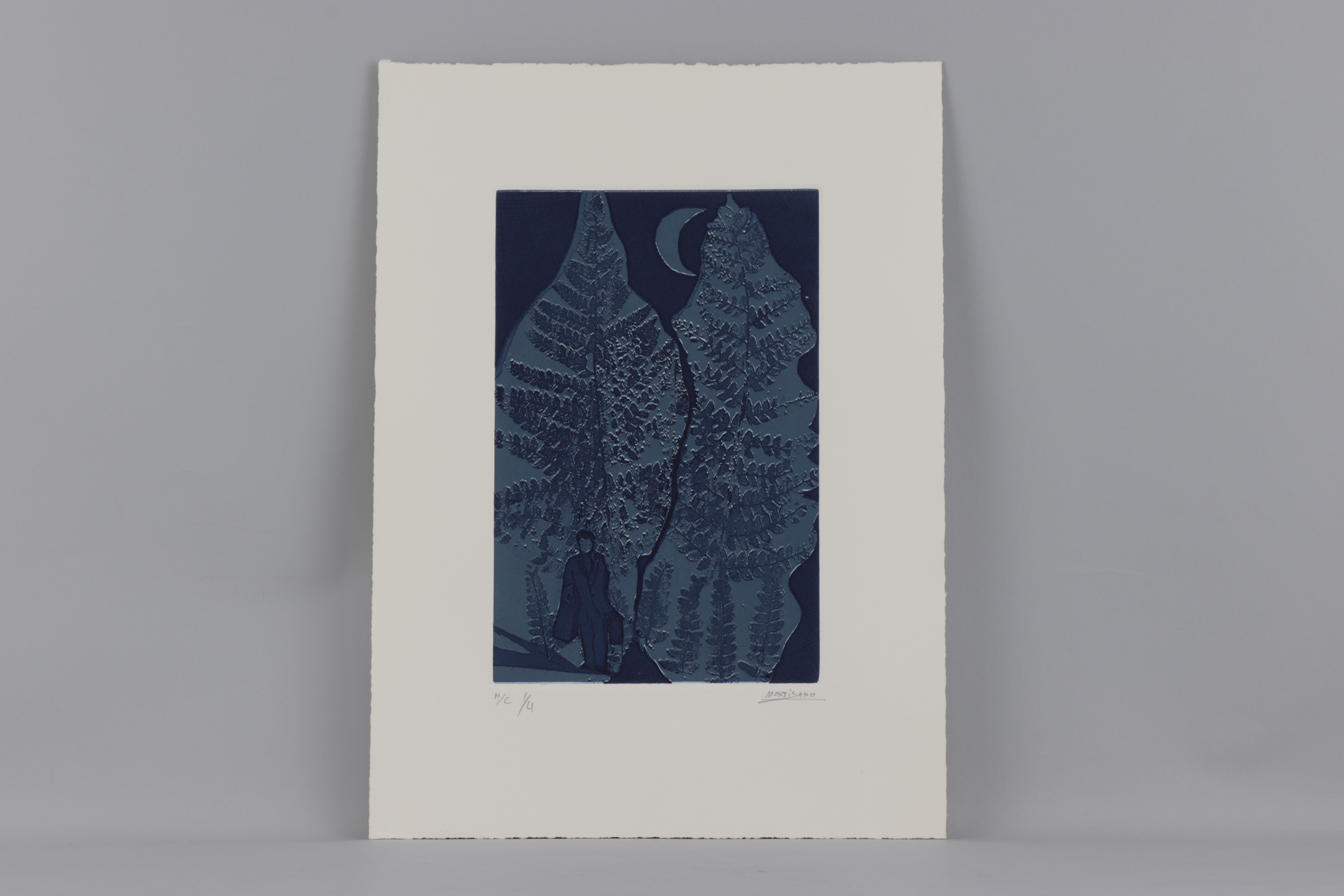 Estampa monócroma en diversas intensidades de azul, grabada a partir de una matriz compuesta por una plancha de zinc, con las técnicas de la aguatinta y el barniz blando. La estampación se realiza con dos tintas en relieve y hueco, sobre papel superalfa 250 gr.