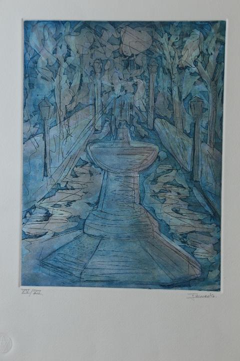 Paisaje urbano grabado en una estampa de formato vertical. La gama cromática juega con azules y suaves ocres, aplicados mediante la técnica del aguatinta, con manchas de delicada transparencia que permite emerger la luminosidad del papel. El grabador juega con finas líneas que se superponen en los contornos de la fuete y el trazado del espacio tras esta, enfatizando los perfiles, mientras que juega con la línea ondulante formulada a partir de inesperados giros y sugerencias de volumen.