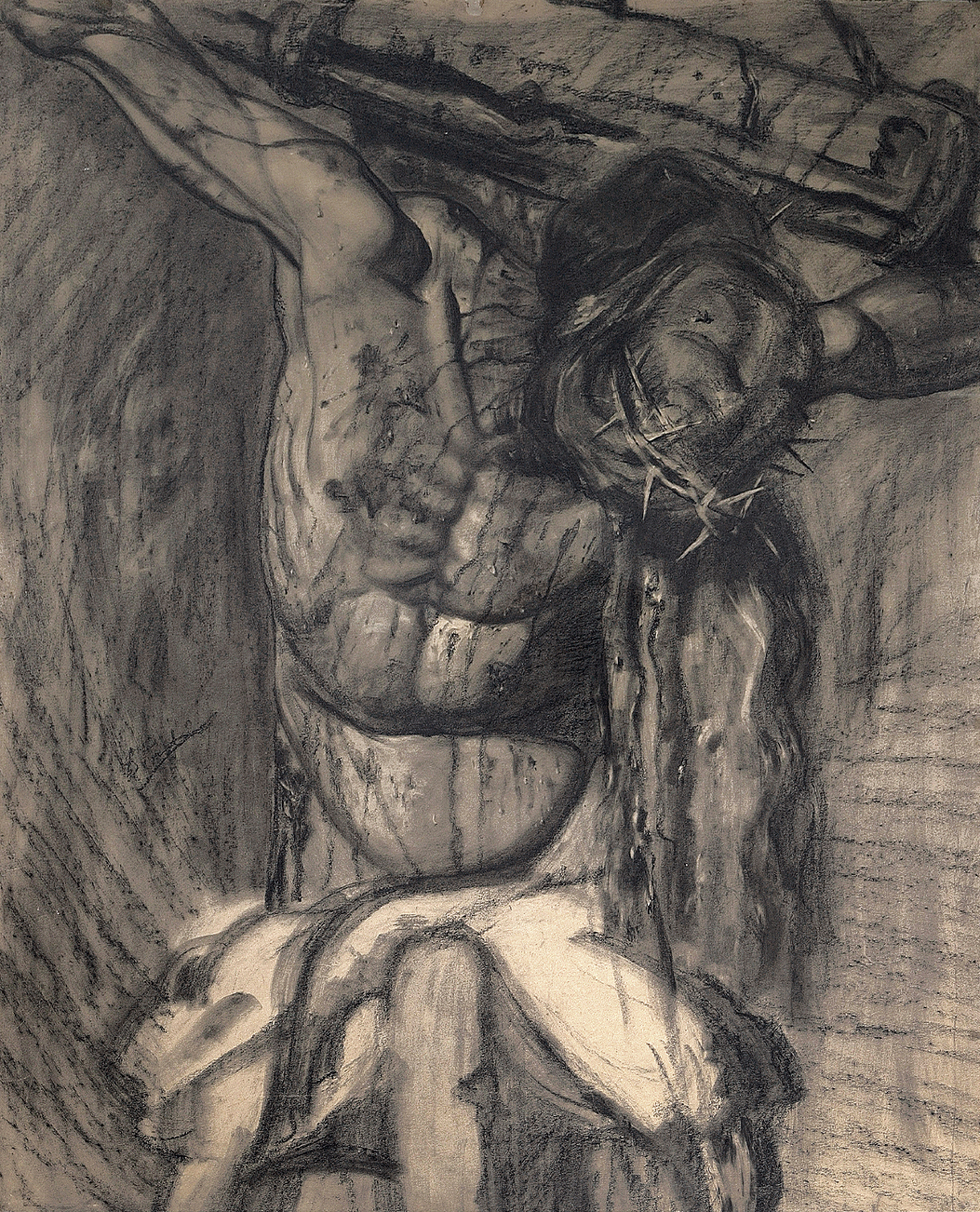 Estudio preparatorio para el Cristo en la Cruz realizado sobre papel caballo con carboncillo y lápiz compuesto (realizado con grafito o carboncillo mezclado con cera o arcilla) y pegado sobre táblex.