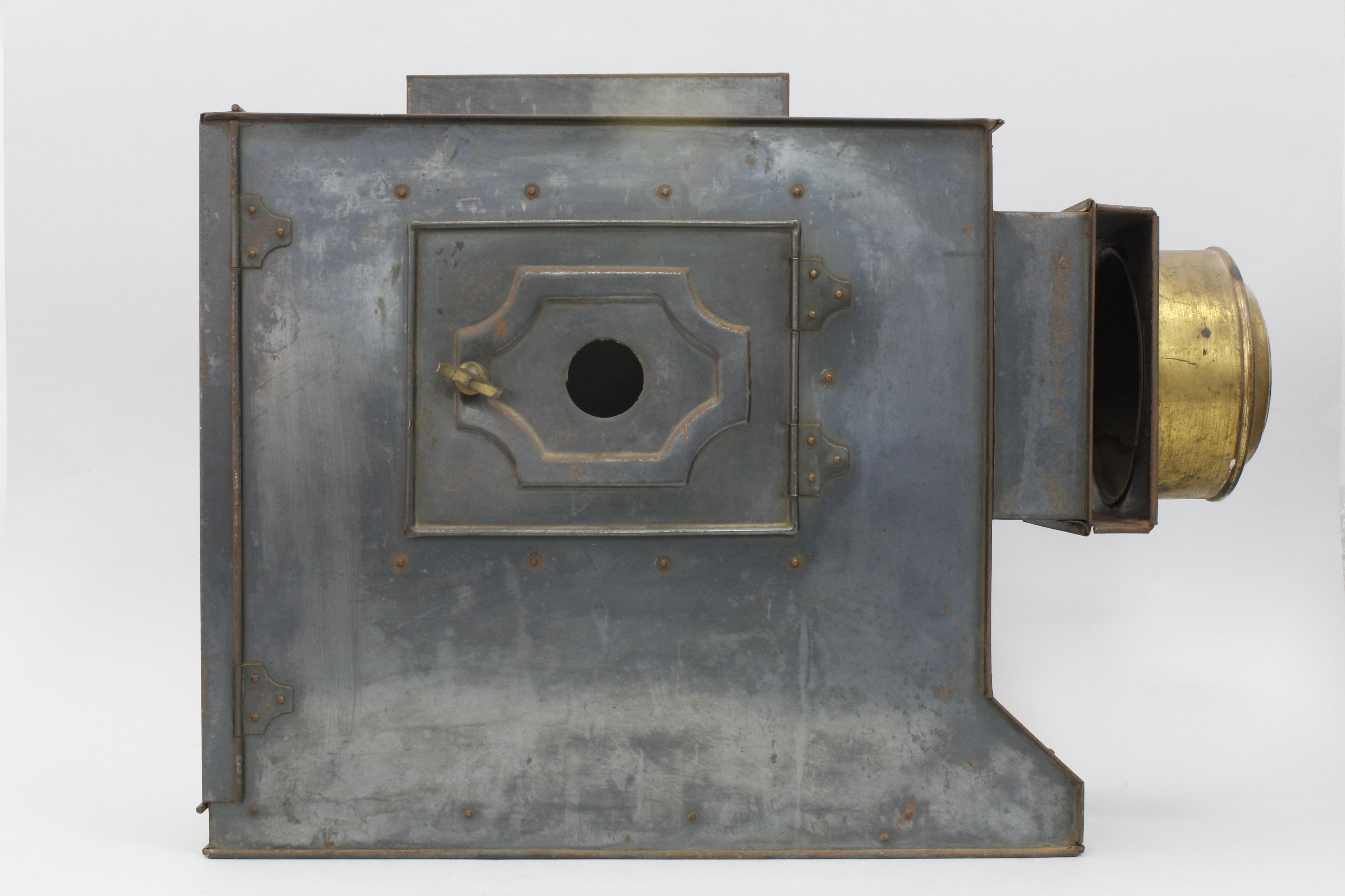 Antigua "linterna mágica" de proyección marca Prima. Consta de una cámara oscura con un juego de lentes. Conserva el cañón del objetivo. En la parte superior tiene un gran hueco que pertenece a la chimenea, con la tapa de cierre.