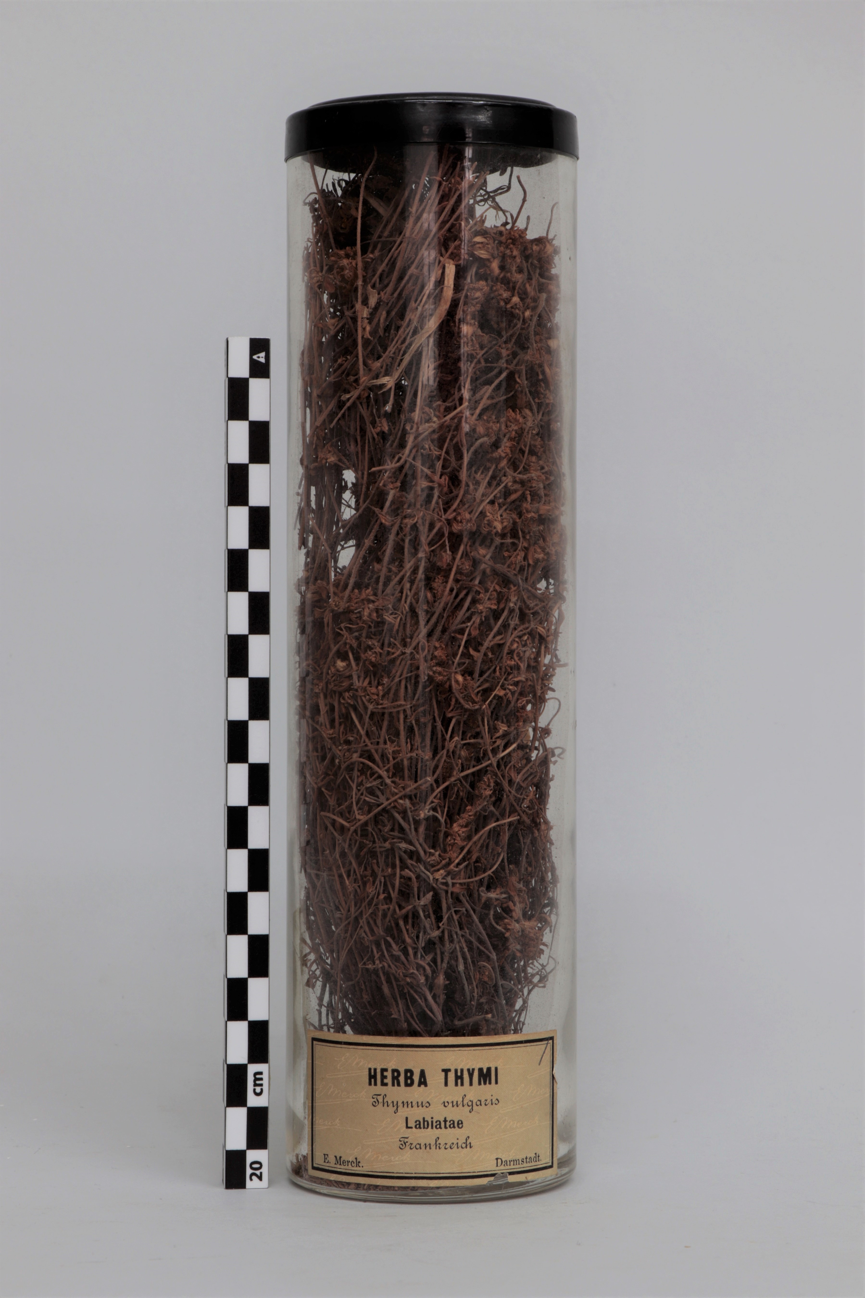 Bote de vidrio cilíndrico que contiene hojas de Thymus vulgaris, comúnmente conocido como tomillo. En el exterior del bote lleva adherida una etiqueta rectangular de papel escrita a máquina, donde se contempla el nombre de la sustancia contenida, su lugar de origen y la empresa que lo ha fabricado (E. Merck con sede en Darmstadt, Alemania). La tapa del bote es de un plástico rígido de color negro.