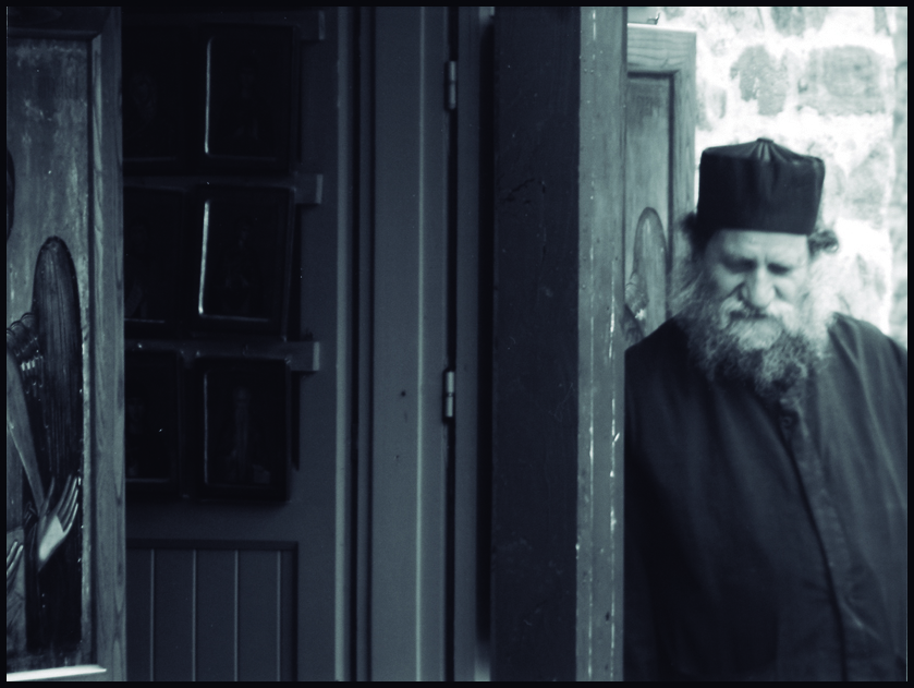 Apreciamos a un señor con vestimenta propia de monje ortodoxo en una tienda de iconos, encontrándole con la mirada hacia abajo en esta instantánea, probablemente en actitud pensativa.