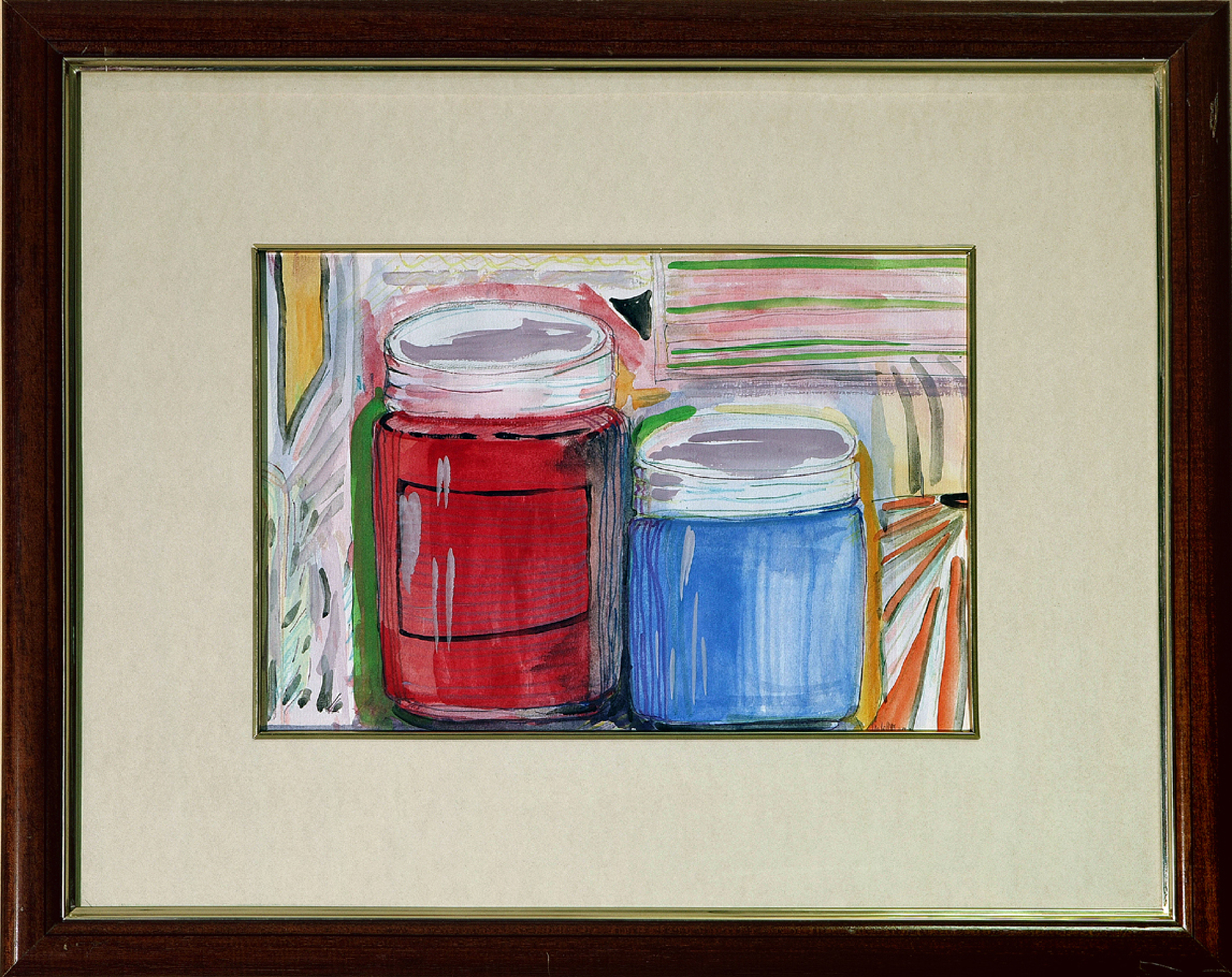 Bodegón en el que se representan dos botes uno de mayor tamaño en tonos rojos y otro algo menor en azules.