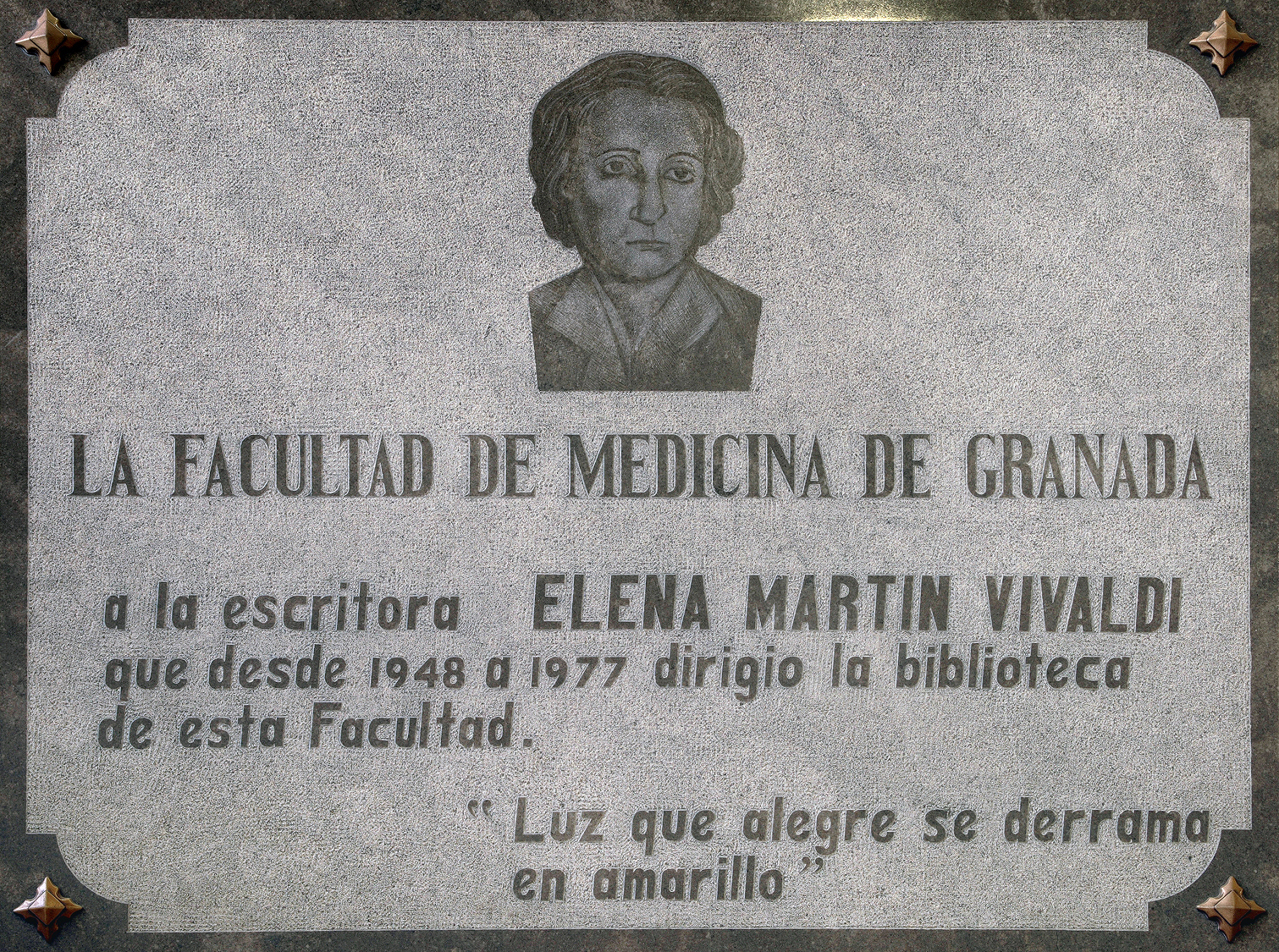 Lápida labrada en piedra de Sierra Elvira, caliza gris de gran dureza, en la que se representa un retrato de la homenajeada bajo el cual puede leerse: LA FACULTAD DE MEDICINA DE GRANADA/ a la escritora ELENA MARTÍN VIVALDI/ que desde 1948 a 1977 dirigio la biblioteca/ de esta Facultad./ " Luz que alegre se derrama en amarillo".