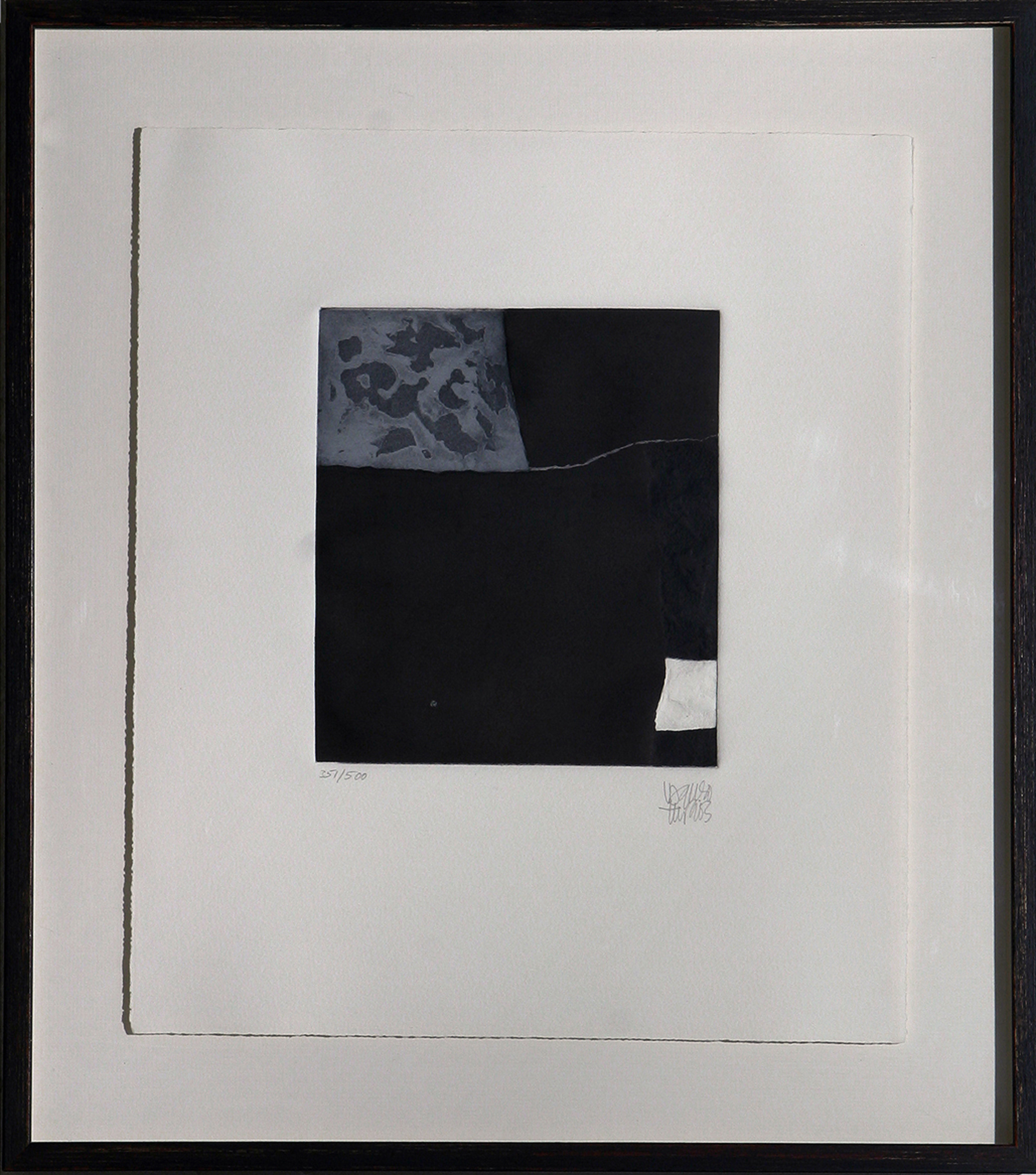 Obra abstracta que plantea el negro como color invasivo casi de toda su superficie. En el margen superior se despliega una línea sinuosa que recorre de lado a lado la huella como si fuese un hilo, y enlaza con un espacio de grises degradados por la disolución de la tinta en agua, ocupándo el ángulo superior derecho. En el opuesto se produce un fuerte contraste con el blanco de una forma cuadrada irregular que se adhiere al margen derecho del grabado, sirviéndole de límite.